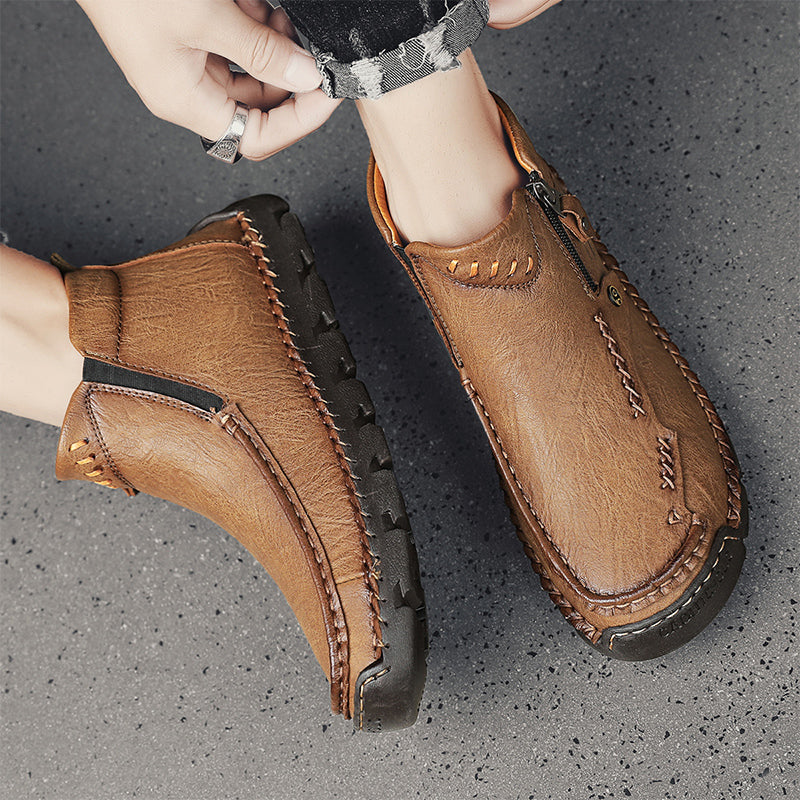 These men's casual leather shoes are the perfect combination of style and function. The classic design features a mid-cut ankle boot style with a look inspired by moccasins. The stylish and simple silhouette makes these shoes easy to pair with a variety of outfits, whether it's jeans, chinos or suits. Whether you're going for a casual day or a more formal occasion, these shoes will add a touch of sophistication to your look.