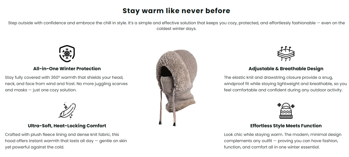 3) Embrace the Warmth: Step outside and feel the difference — cozy fleece, stylish knit, and 360° coverage that keeps you warm, confident, and winter-ready all day long.